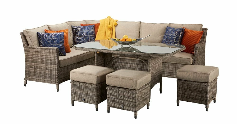 The Signature Weave Edwina Corner Dining Mixed Nature Weave has well padded cushion positioning the users in to a healthy posture. With the rattan, glass and fabric being effortless to maintain this set keeps you relaxing at all times. The tables a good size allowing plenty of space for all your beverages and food to placed and enjoyed from the sofas and stools.Â