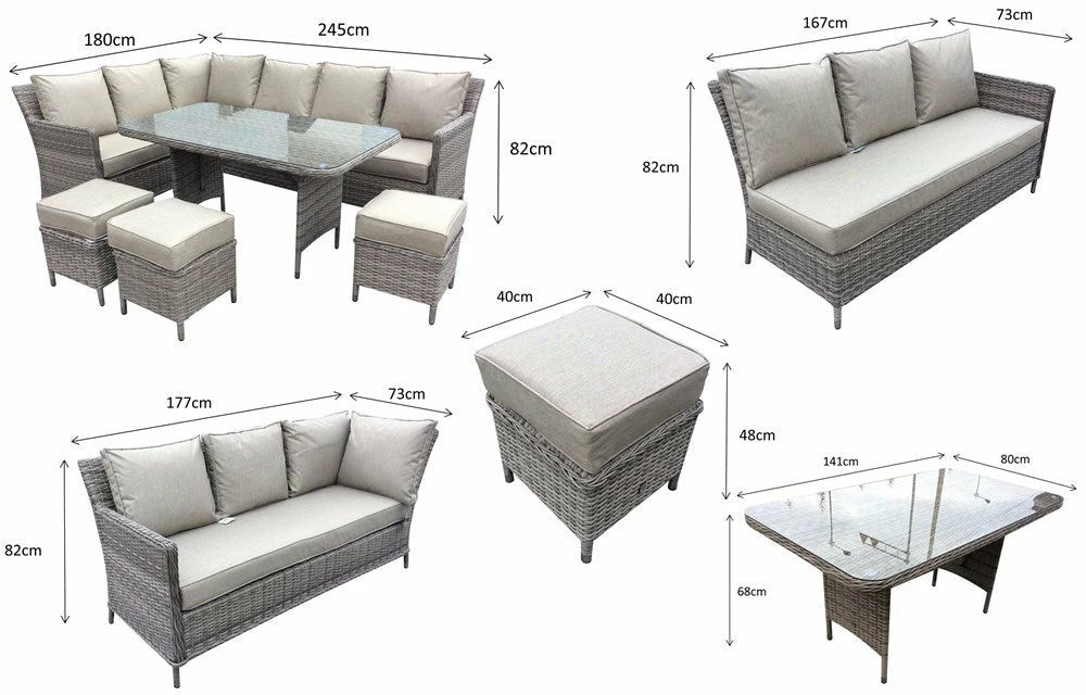 The Signature Weave Edwina Corner Dining Multi Grey Wicker has a strong and stable table ideal for meal times. With the glass top on the table there’s little cleaning down and another material that brings charm and character to the set. There’s extra stools when guests come round your going to have extra space for entertaining. The fabric cushions bring comfort for everyone and the back and arm rests support all in all your in a healthy position. Â