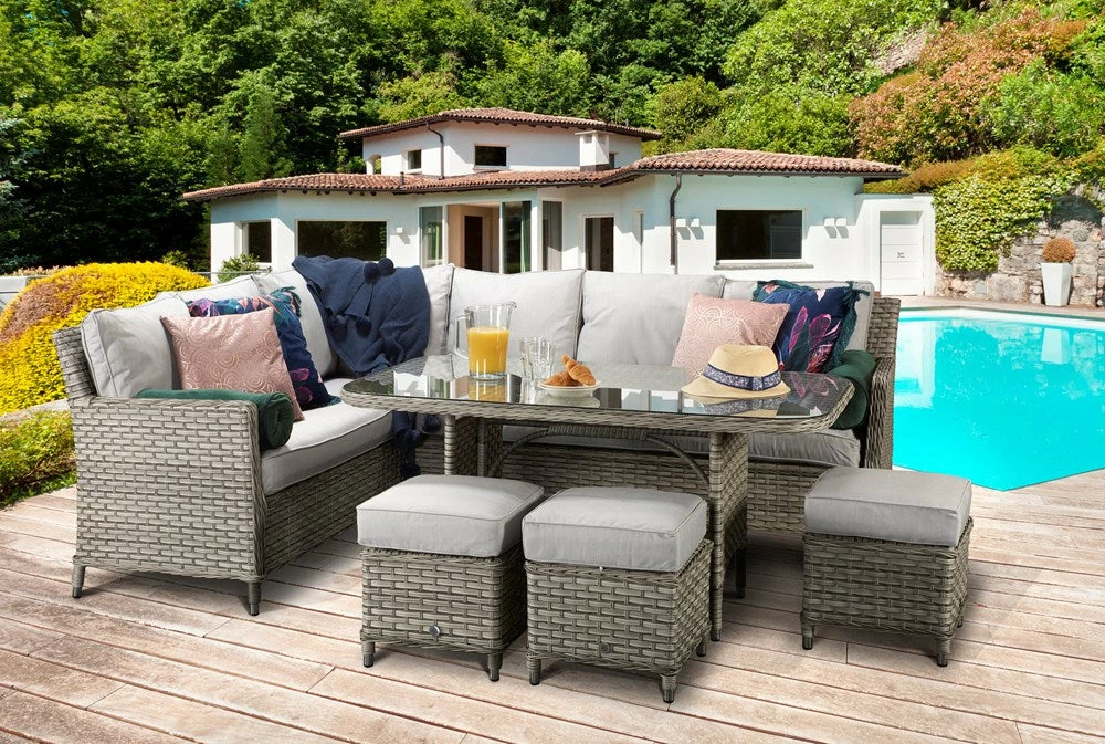 Stunning and sophisticated this large sofa corner dining set would impact the garden in terms of style and comfort. Featuring a corner sofa, stools and a table there’s plenty of space for entertaining and family times. The metal and wicker frame combination bring long lasting and effortless ,maintenance values to the set.Â