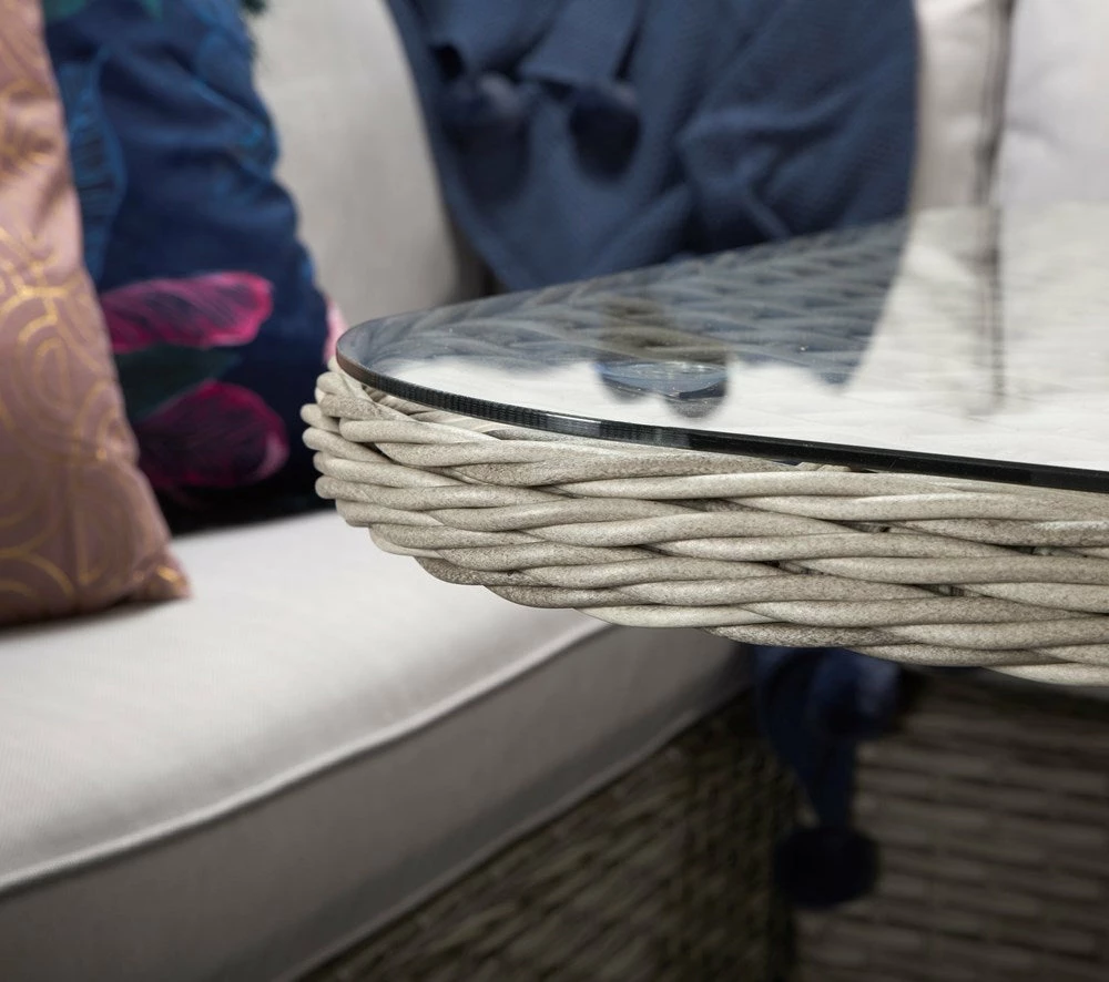 With the Signature Weave Edwina Corner Dining Set 3 Wicker Special Grey you gain a large table. The wicker rattan frame brings a stable foundation while the glass top adds a spacious surface for all your drinks and food to placed ready to consume. Place the set on patios, decking and grass with the legs providing a reliable platform to the set.Â