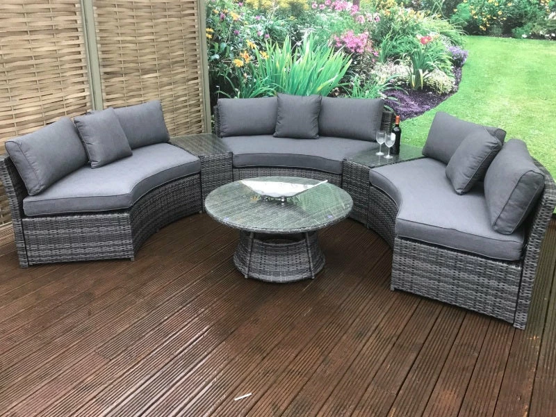 Sophisticated and fashionable this curved half moon garden sofa set will gain you some where to spend your evenings and days during the summer. Designed with space in mind there’s a certain class and charm about the set not just in it’s shape but in it’s personality. The fabric cushions are going to bring you comfort and support while you dine along with the back pillows your ready to chill.Â