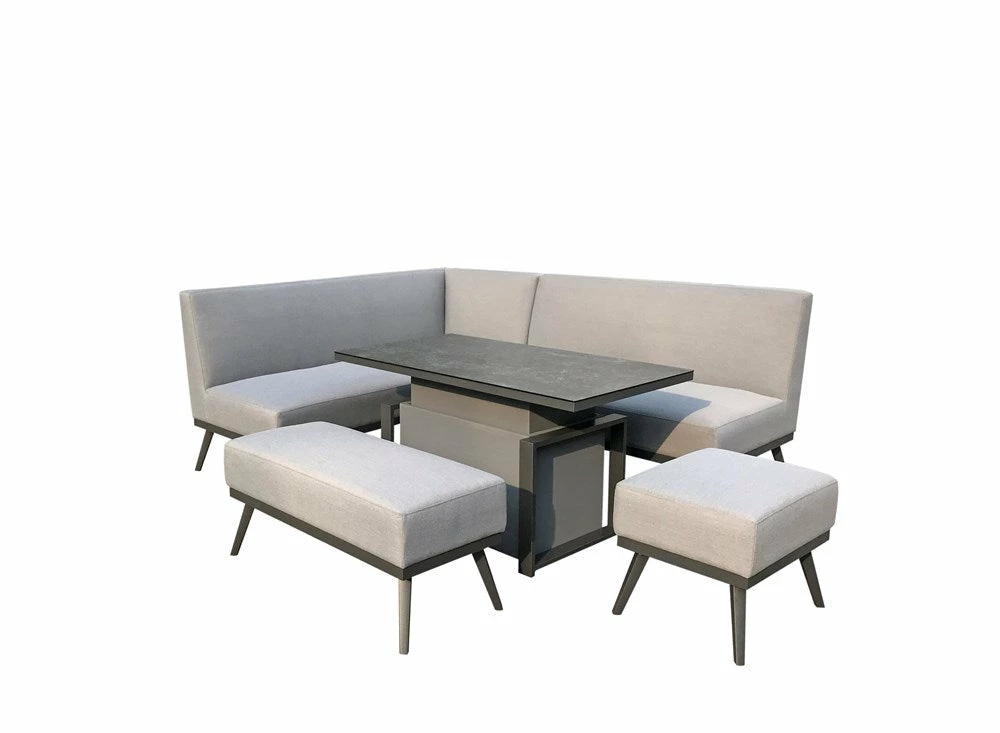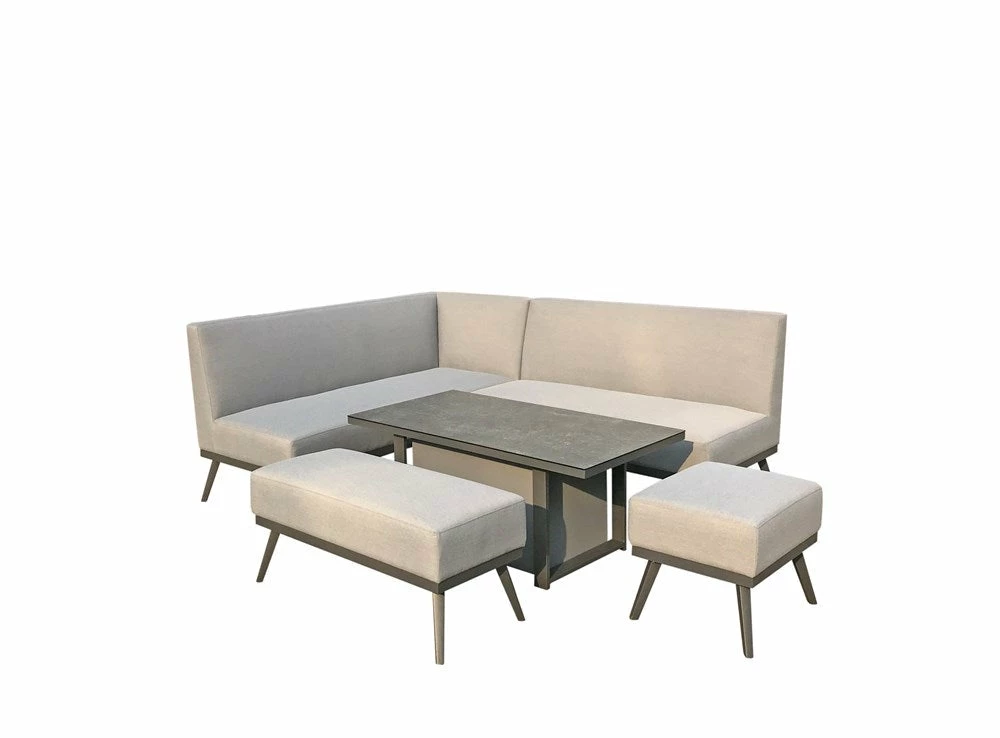 The Kimmie fabric sofa set would bring sophistication to any out door garden area. With the fabric and metal combination is modern and reliable ideal for the whole year round. Featuring a corner sofa with a stool table and bench with this set there’s plenty of space for entertaining and family times.Â