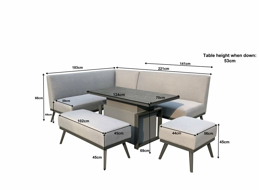 The Signature Weave Kimmie Fabric Sofa Dining with Gas Lift Table is built for comfort and reliability. With the stain and water resistant materials this buys for the long term. The metal foundation and legs would be suitable for patio, grass or decking areas. There’s the gas lift up table which could be used in different scenarios. Â