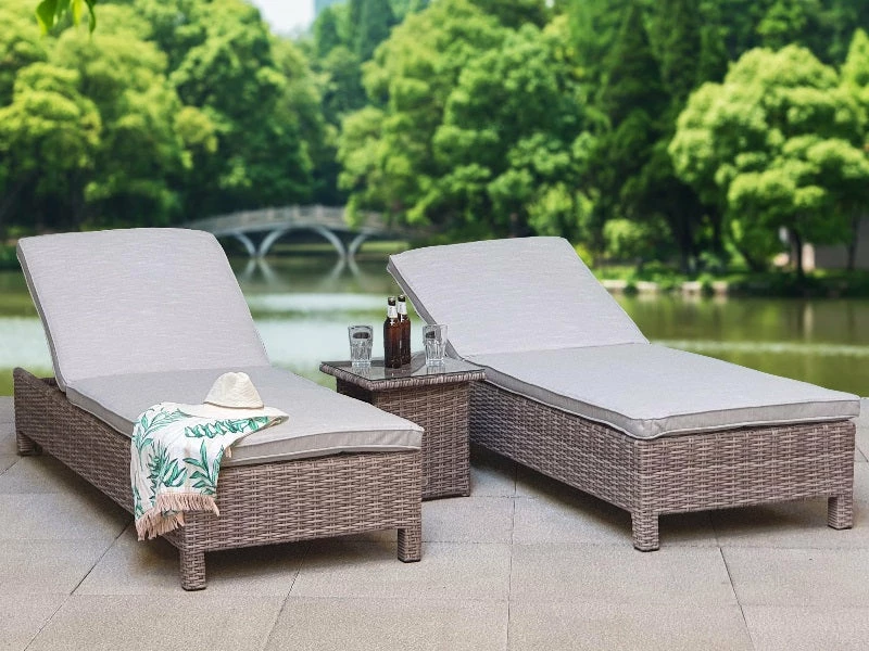 Model –Â Sarena Rattan Sunbed Set with Coffee Table –Â SARE0046 Nature /Â SARE0105 Caramel /Â SARE0106 Grey Victoria Weave /Â SARE0258 GreyÂ