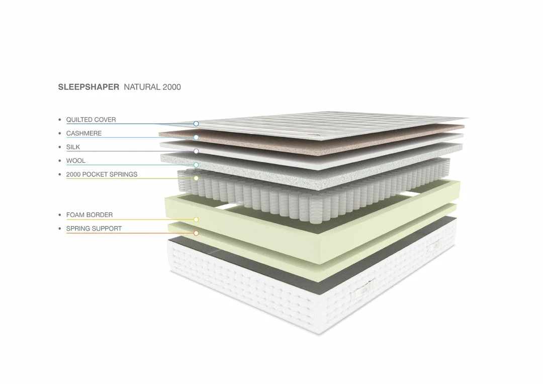 Sleepshaper Natural Pocket 2000 Mattress. The Mattress has wool, silk and cashmere fillings lay on 2000 Pocket Springs. The Mattress also has a foam border along with a layer of foam spring support.