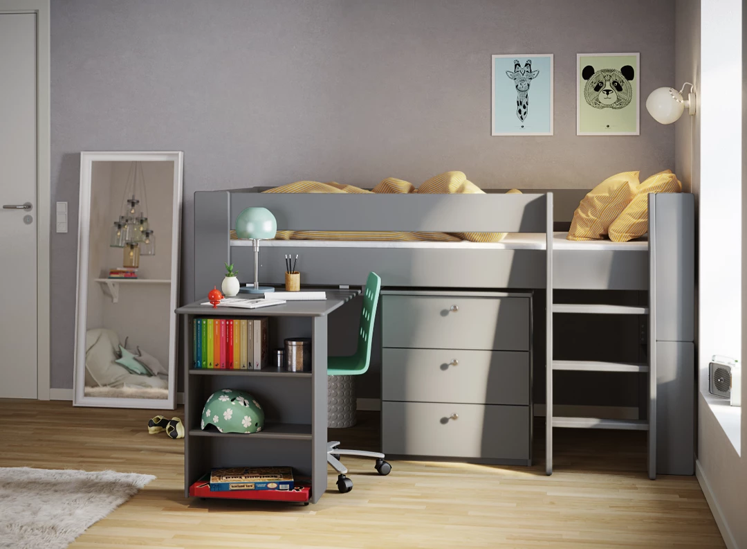 This grey pull out desk has all the makings of a quality edition to the Steens for kids bed. The shelving could be used for multiple items like books and paper work. The vibrant grey suits the other steens furniture in the same range. Easy to construct just follow the instructions provided.Â