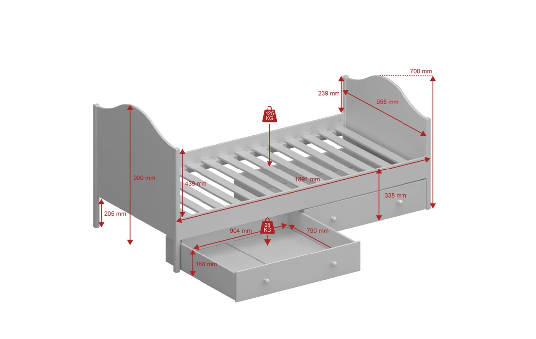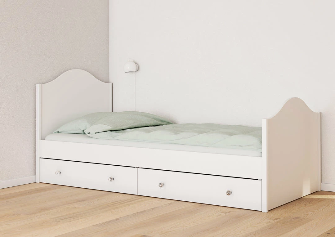 Practical and stylish this white draw bed will give your child all the storage they need in the bedroom. The large draws will be able to hold objects like clothes and bedding making extra space in the bedroom. The design in modern and stylish with the headboard and footboard working in tandem together.Â