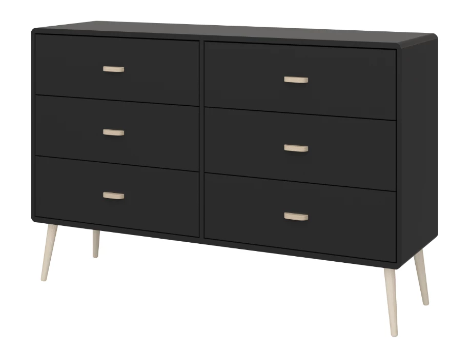 Whether the Steens Mino 3 + 3 Wide Chest Black is bought for a large or small bedroom the design helps with light. With the spread legs not just looking great they also elevate the chest from the floor giving the illusion of space. The oak and painted MDF work well together in terms of style and longevity values.Â