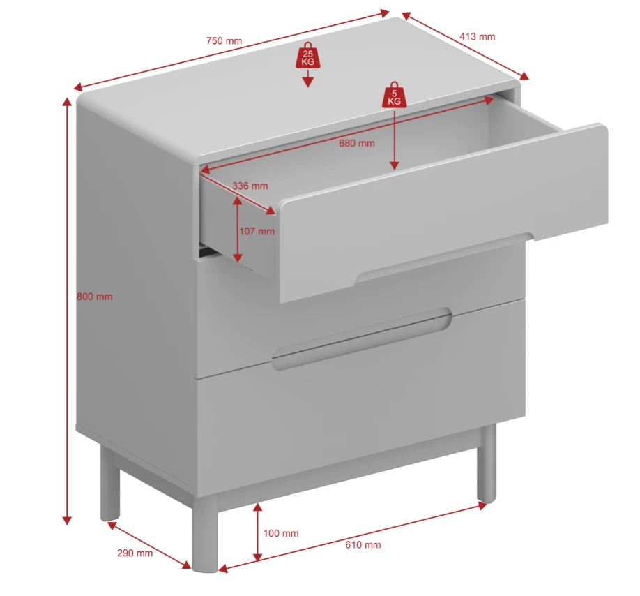 The Steens Oniria 3 Drawer Chest White having a stable foundation is strong and sturdy. The legs elevate the chest from the floor providing an illusion of space in the bedroom which is great for small bedrooms. The chest of drawers comes flat packed which means less stress on delivery day.Â