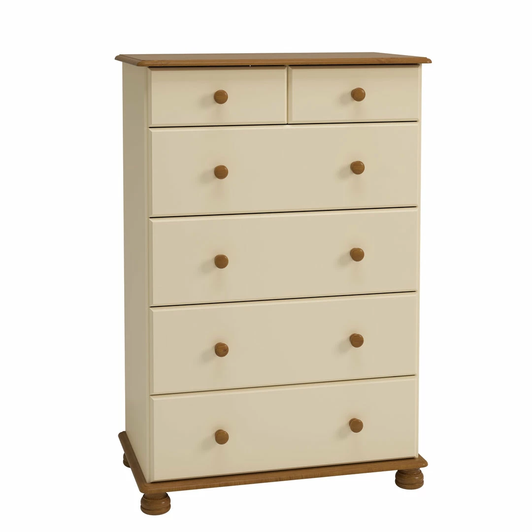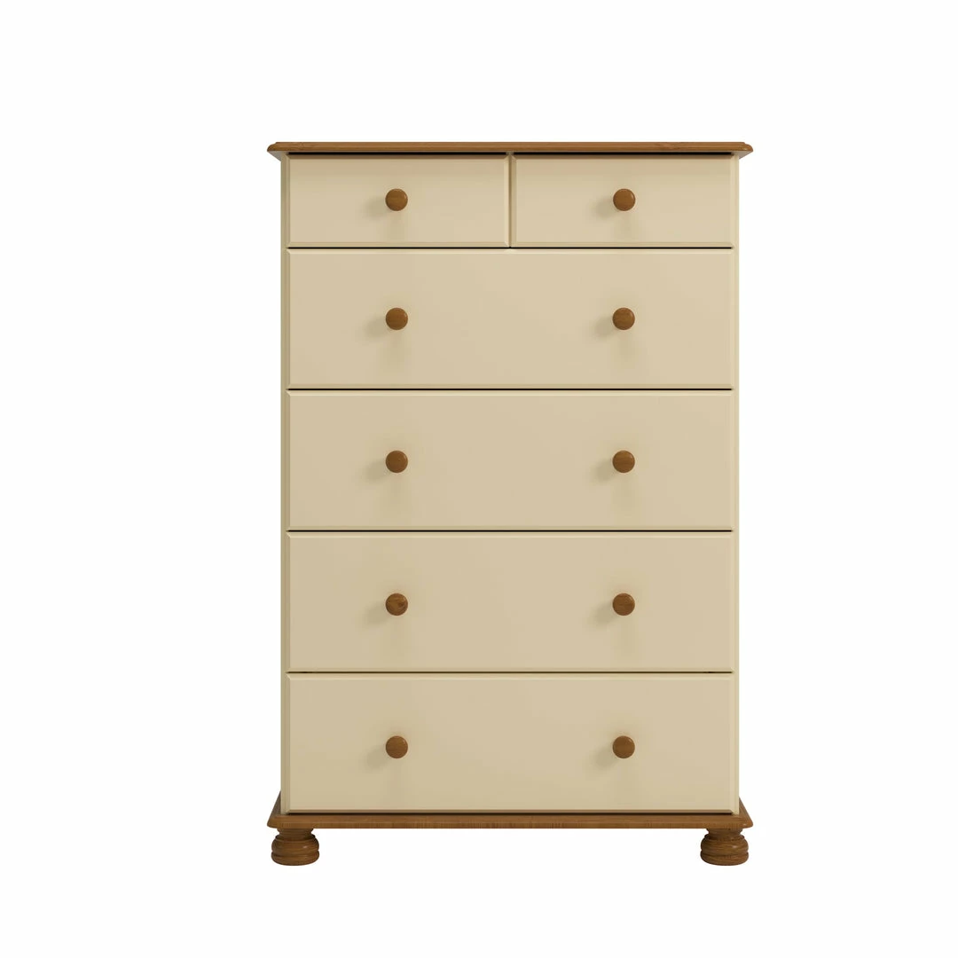 The Richmond cream and pine 2 + 4 chest of drawers has a two tone design that will add some style to your bedroom. There’s plenty of storage space in the chest for household items.Â