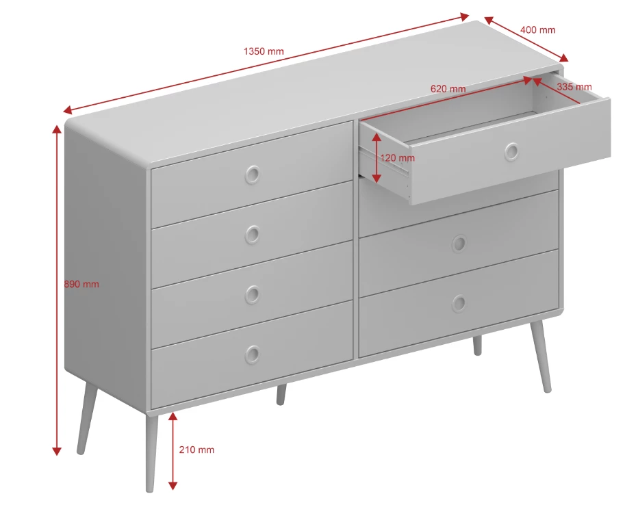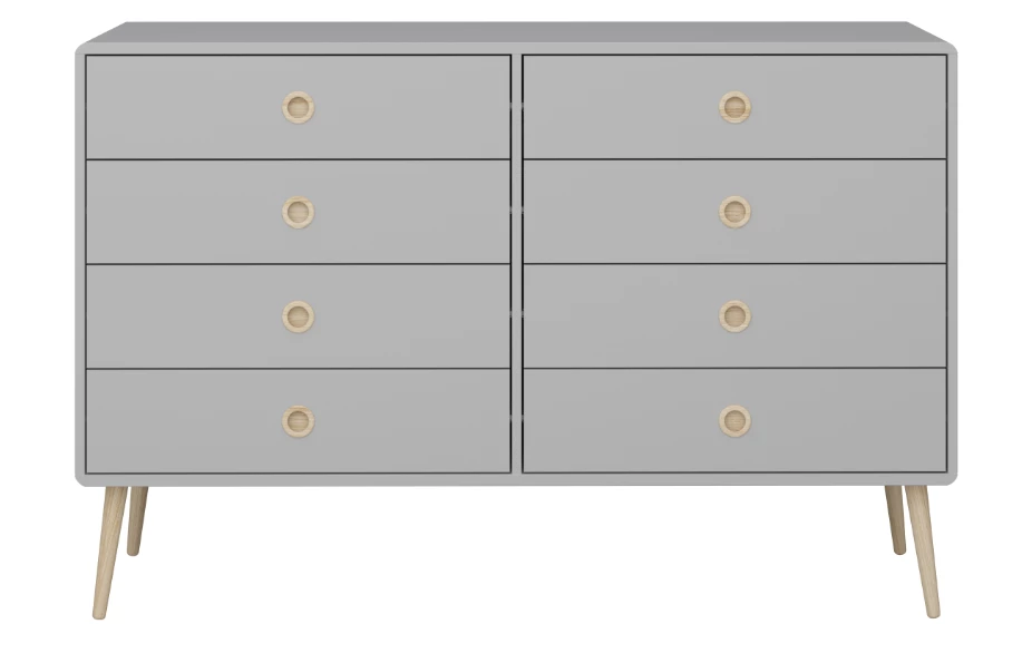 Whether the Steens Soft Line 4 + 4 Wide Chest Grey is selected for a small or big bedroom the size isn’t over powering but just right for the job. With the slightly curved edges bringing charm and character, it’s these little details that make this chest what it is. The wooden oak handles make accessing the draws effortless and with the strong metal runners the drawers are long lasting.Â