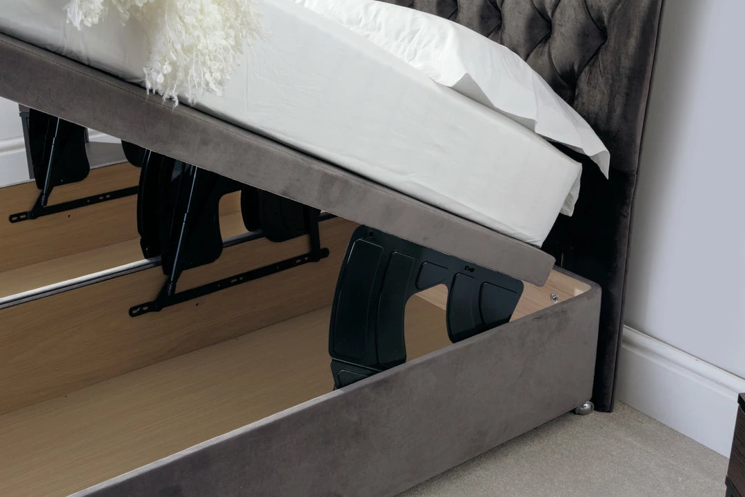 The Fabric ottoman storage bed comes with a high quality end lift. The ottoman is available in a range of fabrics and comes on stylish castors. Safety comes at the highest regards and the furniture industry research association (FIRA) gave this model an outstanding review.Â