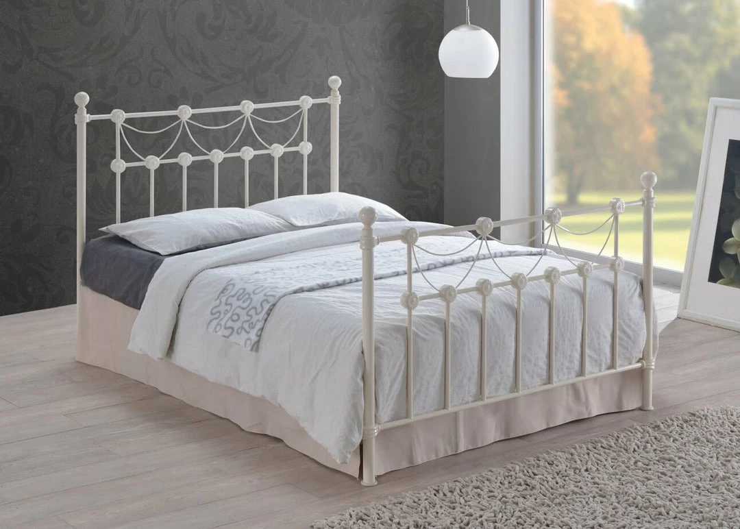 Elegant and charming this ivory bed frame could bring elegance and class to any stylish bedroom. The ivory colour is modern and contemporary working well due to the neutral aspects. The matching foot and headboard allow light to flow around the bedroom this metal bed frame could work against walls and in corners.Â