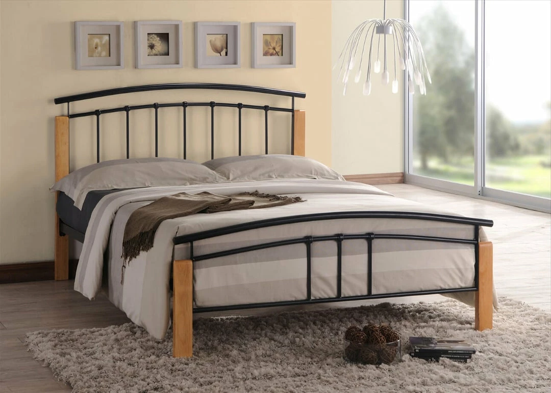 Manufactured in a large range of sizes the Time Living Tetras Black and Beech Metal Bed Frame would work in large or small bedrooms. The matching foot and headboard keep things simple but provide a charming effect. The chunky wooden posts and metal frame bring support and reliability to the bed frame for long lasting values. With a slatted base your mattress will be improved in terms of ventilation and gain a supportive foundation.