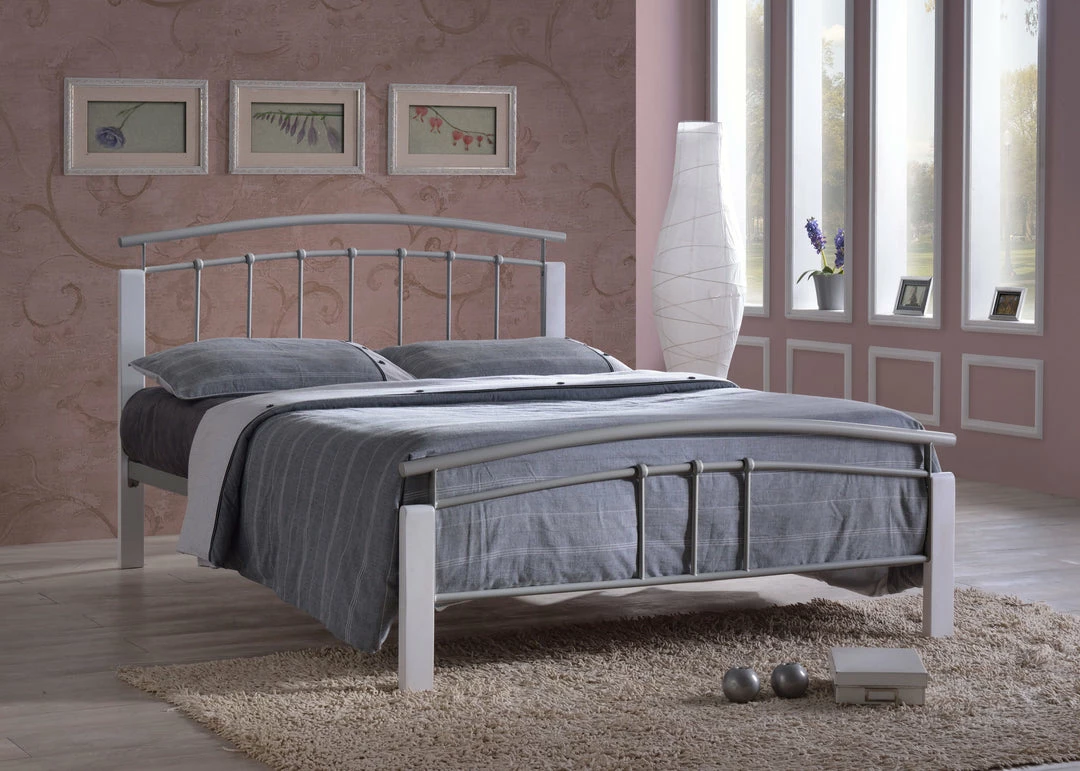 The Time Living Tetras Silver and White Metal Bed Frame can be obtained in a large range of sizes this provides options to the buyer. Choose from single right up to king sizes make sure to measure the bedroom and allow space for extra furniture. Both metal and wood can be cleaned down and polished easily adding low maintenance values to the buy.Â