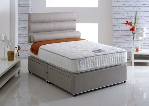 The Emperor latex 1500 Divan bed has a mattress that features a pocket spring unit with latex and luxurious polyester fillings. The cover is soft knitted natural touch fabric to keep your body at optimal temperature while you sleep. With a 3 tier stitched boarder to help with corrosion and give you and your partner full use of the model. Just rotate to add comfort through the years follow the instruction booklet provided. The base is available in a neutral fabric that will add style and sophistication to your bedroom. With twin castors and linking bars and available in various draw options.