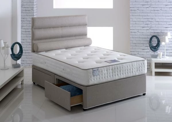 The Latex Paedic Divan Bed has a mattress that features an orthopedic spring system and Latex with luxurious polyester fillings to your comfort. With a rod edge support and a 3 tier stitched boarder to prevent corrosion to the side. A high quality soft knit natural fabric cover is added to keep your body at optimal temperature while you sleep. The quilting has been sculpted to add a more comfortable feel. The base comes in various draw option’s and has a beige fabric that will add a certain style to your bedroom. With twin castors and linking bars added as a standard.